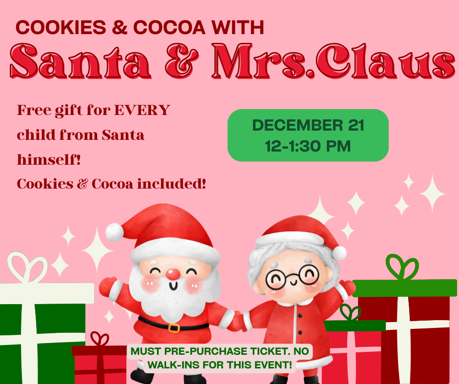 Upcoming Events Cookies & Cocoa with Santa & Mrs. Clause MUST pre-purchase ticket- no walk-ins for this event. Save your spot!